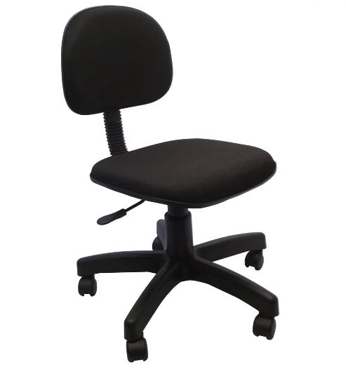 Cadeira giratória secretaria sem braços. Assento e encosto estofados em espuma injetada revestidos em tecido PRETO com bordas em PVC contra impactos. Base de cinco hastes em aço com capa de nylon e rodízios duplos de PP. Regulagem de altura do assento á gás. Encosto fixo em suporte com capa sanfonada.