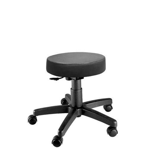 Mocho giratório SEM encosto. Assento estofado em espuma injetada revestido em courvin PRETO. Base de cinco hastes em aço com capa de nylon e rodízios ou sapatas deslizantes. Regulagem de altura do assento á gás.